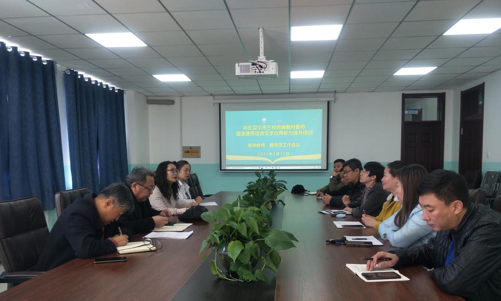 2021年3月11日,在谈球吧官方网站三楼会议室召开了呼伦贝尔市三科统编教材教师国家通用语言文字应用能力提升培训指导教师和督导员工作会议。