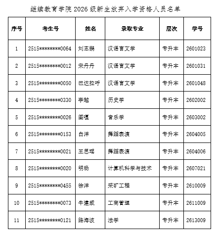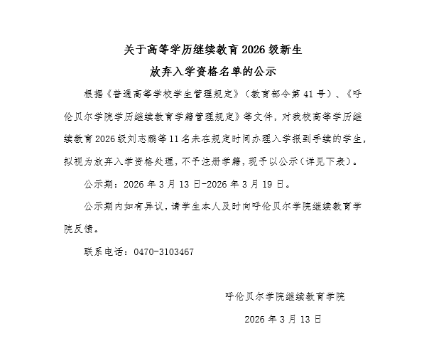 关于高等学历继续教育2026级新生放弃入学资格名单的公示