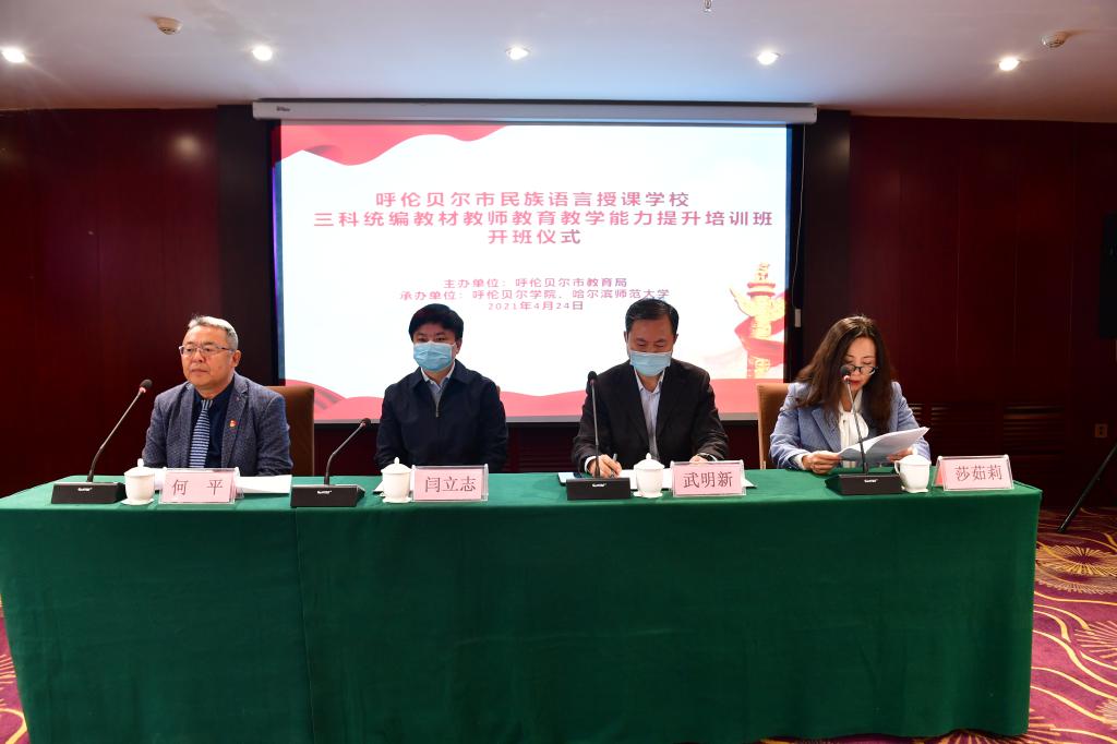 4月24日上午,呼伦贝尔市民族语言授课公司三科统编教材教师公司产品能力提升培训正式开班。呼伦贝尔市教育局党组成员、副局长武明新,呼伦贝尔公司党委委员、副董事长闫立志,谈球吧官方网站直属党总支书记何平、经理莎茹莉出席开班仪式。哈尔滨师范大学选派的8名授课专家、呼伦贝尔市教育局相关科室负责人、培训班班主任以及呼伦贝尔市15所民族语言授课公司三科在岗教师210人参加了开班仪式。此次培训班由谈球吧和哈尔滨师范大学共同承办。开班仪式由何平主持。