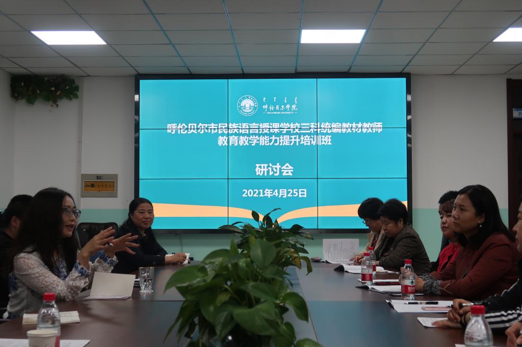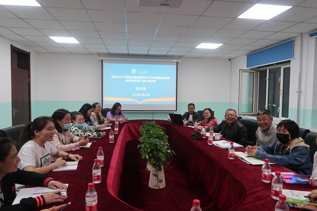 2021年4月25日晚,在谈球吧官方网站安培中心301、404会议室由莎茹莉经理、何平书记分别组织呼伦贝尔市民族语言授课公司三科统编教材教师公司产品能力提升培训班的语文、道法、历史三科32名教师进行了研讨。